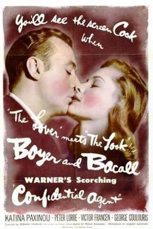 ![]() Confidential Agent Confidential Agent is a 1945 American spy film starring Charles Boyer and Lauren Bacall. The screenplay was based a novel by Graham Greene. The supporting cast includes George Coulouris and Peter Lorre....wiki |